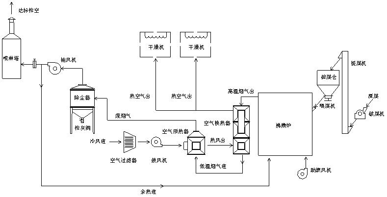 經(jīng)過項(xiàng)目小組的討論與研究,本系統(tǒng)采用了沸騰爐、列管式換熱器、多管+水膜除塵等工藝組成,沸騰爐采用流化床燃燒技術(shù),燃料適應(yīng)性廣,能燃用熱值低于3000kcal/kg的各種煤,且供熱溫度溫度可調(diào),調(diào)溫迅速,燃燼率高達(dá)99%;列管式換熱器高溫段采用耐熱不銹鋼材質(zhì),并設(shè)計(jì)獨(dú)特的梅花狀噴流管結(jié)構(gòu),能有效提升換熱效率,合理的管束排列,能控制煙氣流速穩(wěn)定在10m/s,可避免管子積灰;除塵系統(tǒng)為干法+濕法方案,即廢煙氣先經(jīng)過多管多除塵器,該除塵器由多個陶瓷旋風(fēng)子組成,除塵效率可達(dá)95%以上,風(fēng)阻小于900Pa,運(yùn)行成本低;再進(jìn)入水膜除塵塔,可對廢氣進(jìn)一步凈化,加入脫硫劑,可對煙氣進(jìn)行脫硫。